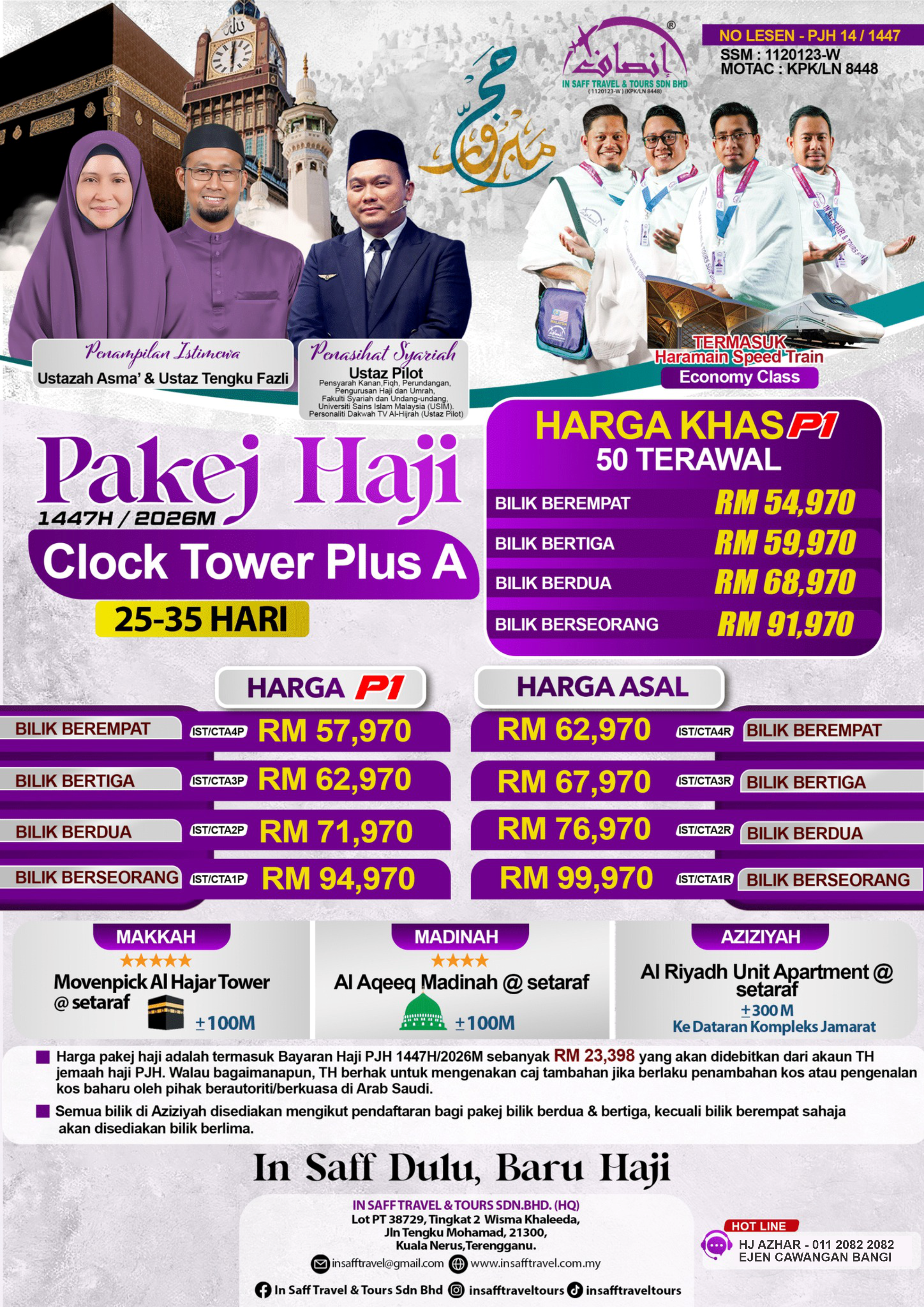 Pakej Haji Clock Tower Plus A 1447H / 2026M – Keselesaan & Kemudahan Maksimum. Nikmati pengalaman ibadah haji yang eksklusif bersama In Saff Travel & Tours Sdn. Bhd. melalui Pakej Clock Tower Plus A — pilihan ideal bagi jemaah yang mahukan keselesaan, lokasi strategik, dan kemudahan bertaraf tinggi.
