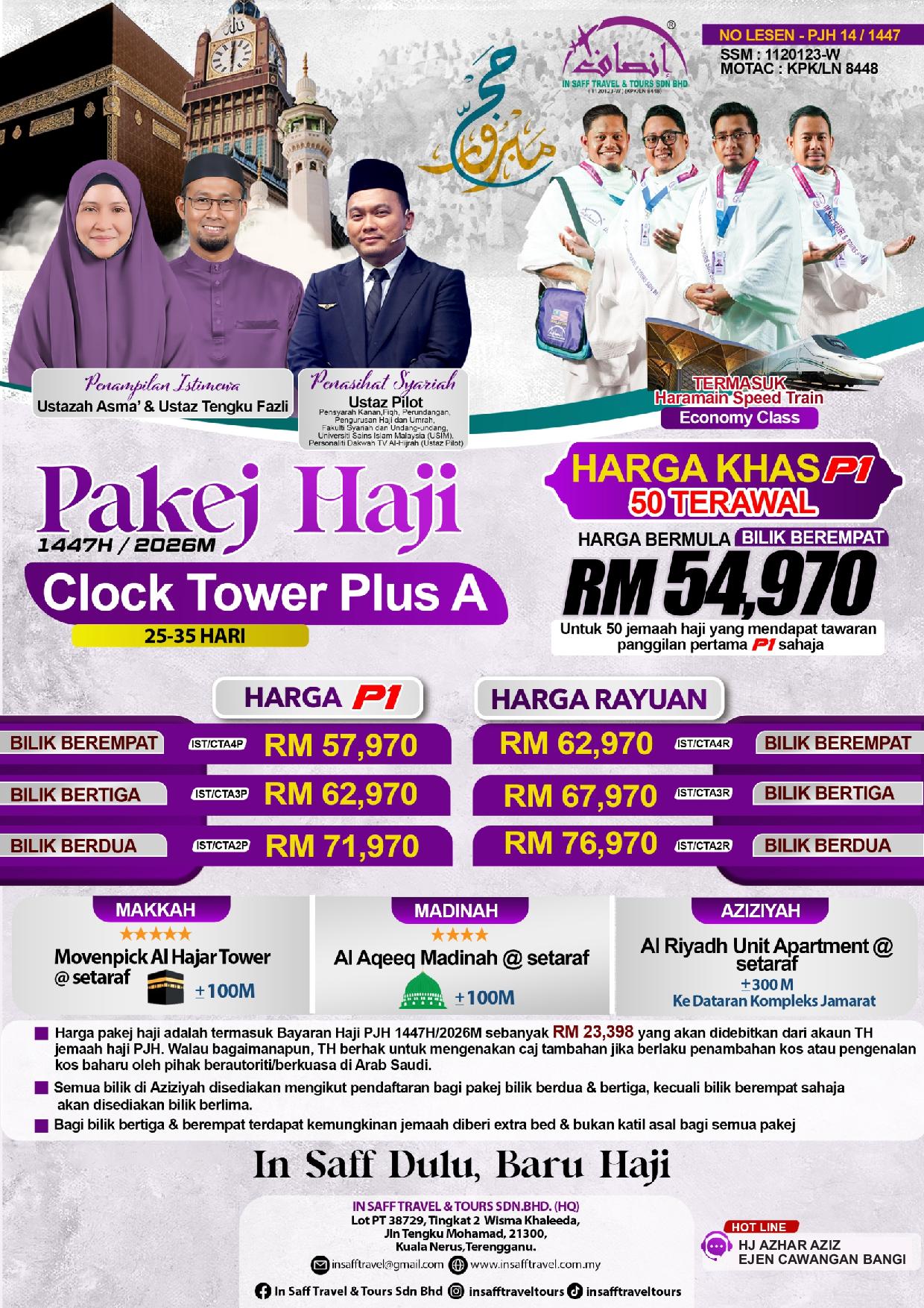 Pakej Haji Clock Tower Plus A 1447H / 2026M – Keselesaan & Kemudahan Maksimum. Nikmati pengalaman ibadah haji yang eksklusif bersama In Saff Travel & Tours Sdn. Bhd. melalui Pakej Clock Tower Plus A — pilihan ideal bagi jemaah yang mahukan keselesaan, lokasi strategik, dan kemudahan bertaraf tinggi.